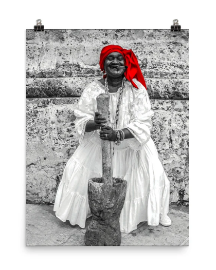 “This photo depicts a Cuban Santera, or a practitioner of Santeria, holding a coffee pilon. The Santera is dressed in traditional white clothing, which is associated with purity and spiritual cleanliness in Santeria. In the background, we can see the lush greenery and tropical foliage that are common in Cuba. The coffee pilon, a staple in Cuban households, represents hospitality and warmth. This photo captures the essence of Cuban spirituality and culture, and showcases the everyday rituals and objects that are an integral part of Cuban life.”