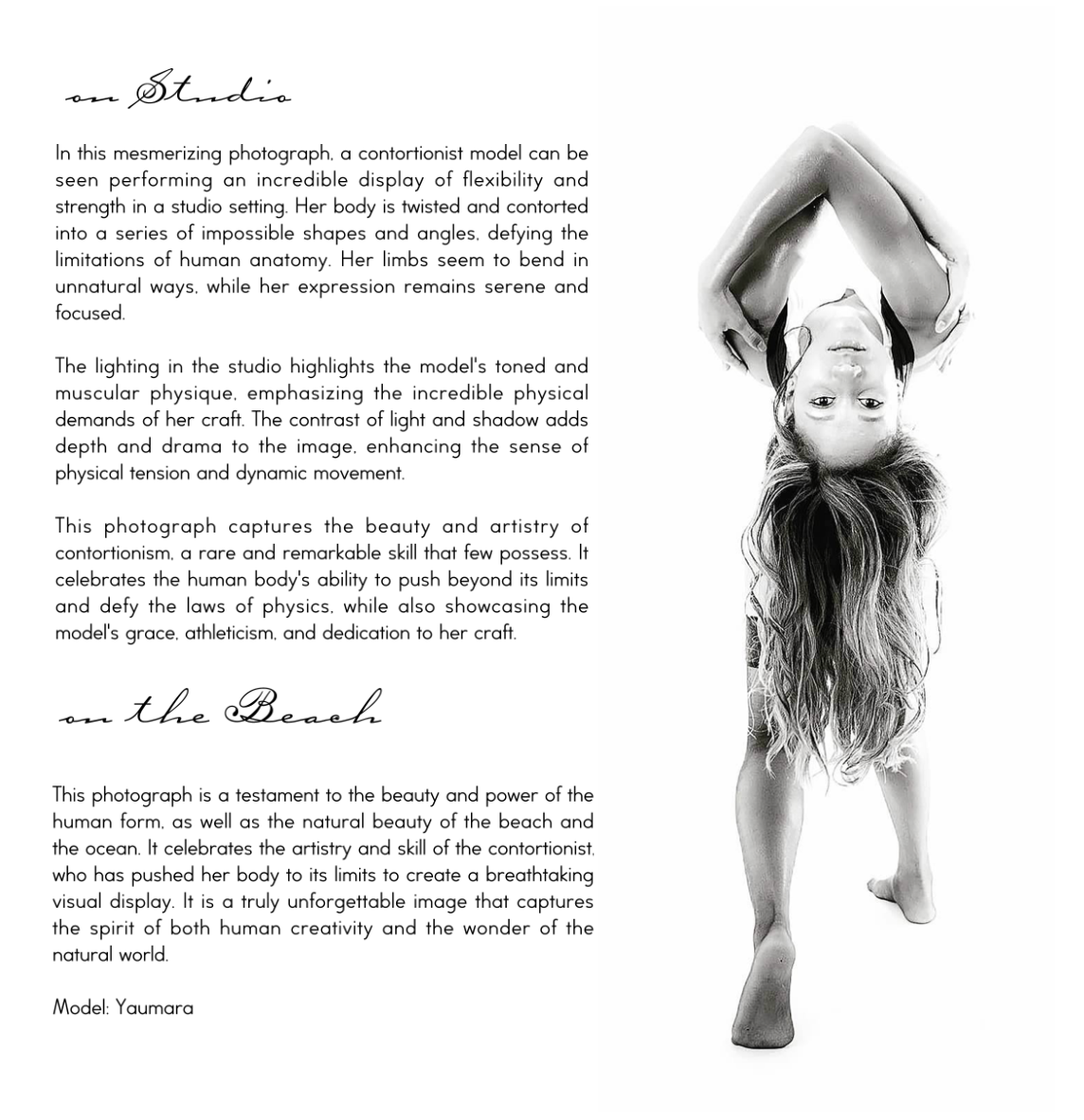 This photograph captures the beauty and artistry of contortionism, a rare and remarkable skill that few possess. It celebrates the human body’s ability to push beyond its limits and defy the laws of physics, while also showcasing the model’s grace, athleticism, and dedication to her craft.