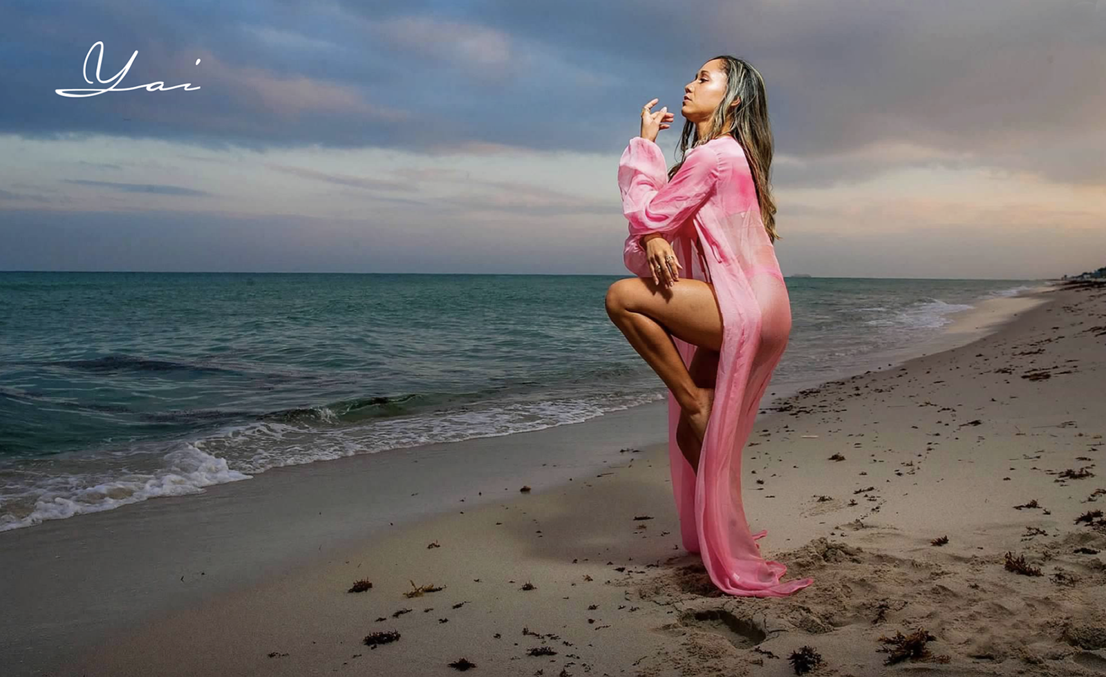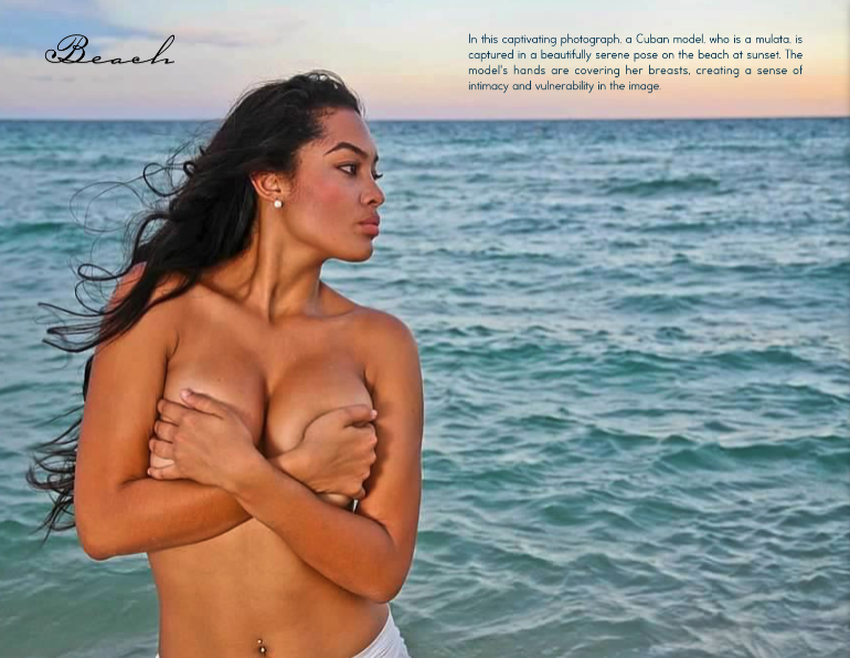 In this captivating photograph, a Cuban model, who is a mulata, is captured in a beautifully serene pose on the beach at sunset. The model’s hands are covering her breasts, creating a sense of intimacy and vulnerability in the image.