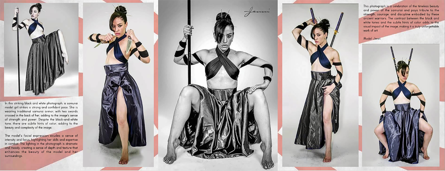 In this striking black and white photograph, a samurai model girl strikes a strong and confident pose. She is wearing traditional samurai armor, with two swords crossed in the back of her, adding to the image’s sense of strength and power. Despite the black-and-white tone, there are subtle hints of color, adding to the beauty and complexity of the image.