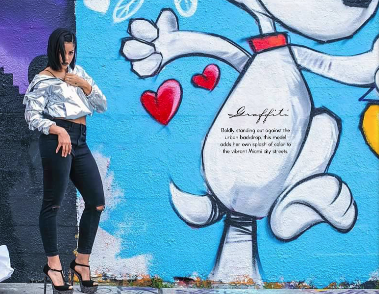 The graffiti provides a dynamic contrast to the model’s classic beauty, and the two elements combine to create an arresting visual image. The bright colors and swirling patterns of the graffiti provide a lively, energetic backdrop that complements the model’s poise and confidence. The overall effect is one of edgy glamour and rebellious beauty.