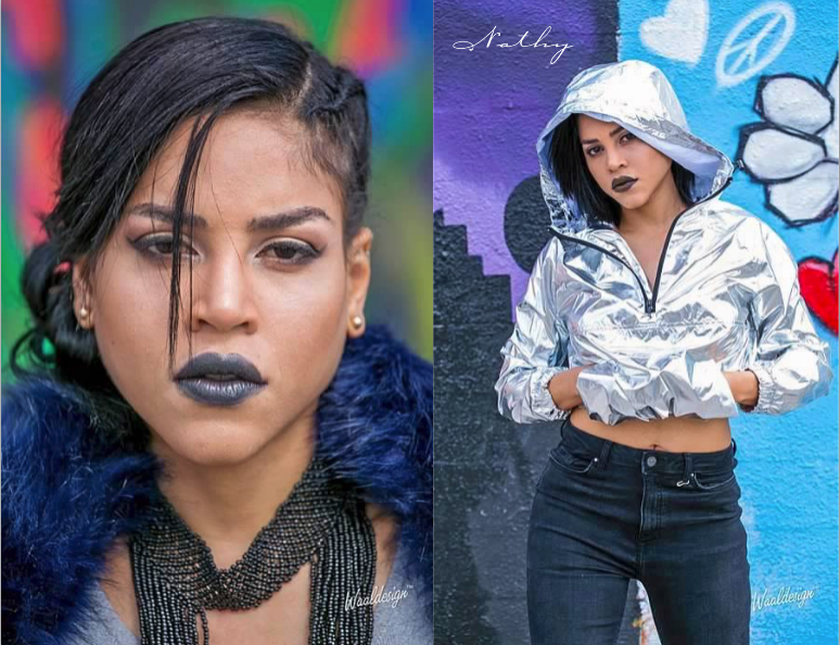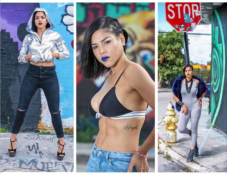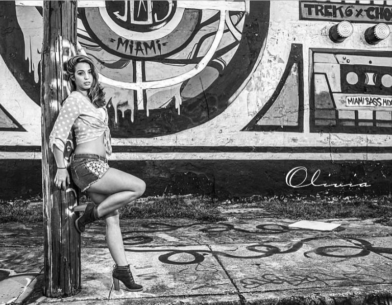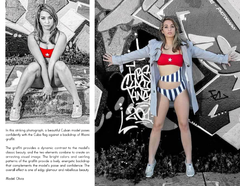 In this striking photograph, a beautiful Cuban model poses confidently with the Cuba flag against a backdrop of Miami graffiti.