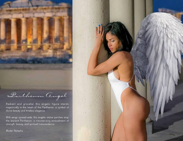 Radiant and graceful, this angelic figure stands majestically in the heart of the Parthenon, a symbol of divine beauty and timeless elegance.