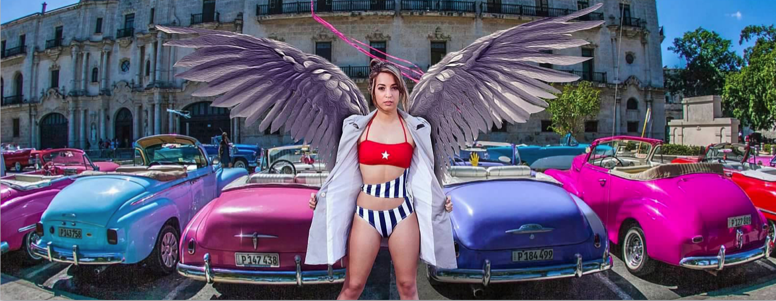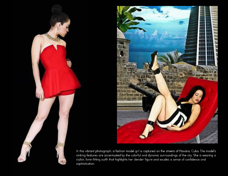 In this vibrant photograph, a fashion model girl is captured on the streets of Havana, Cuba. The model’s striking features are accentuated by the colorful and dynamic surroundings of the city. She is wearing a stylish, form-fitting outfit that highlights her slender figure and exudes a sense of confidence and sophistication.