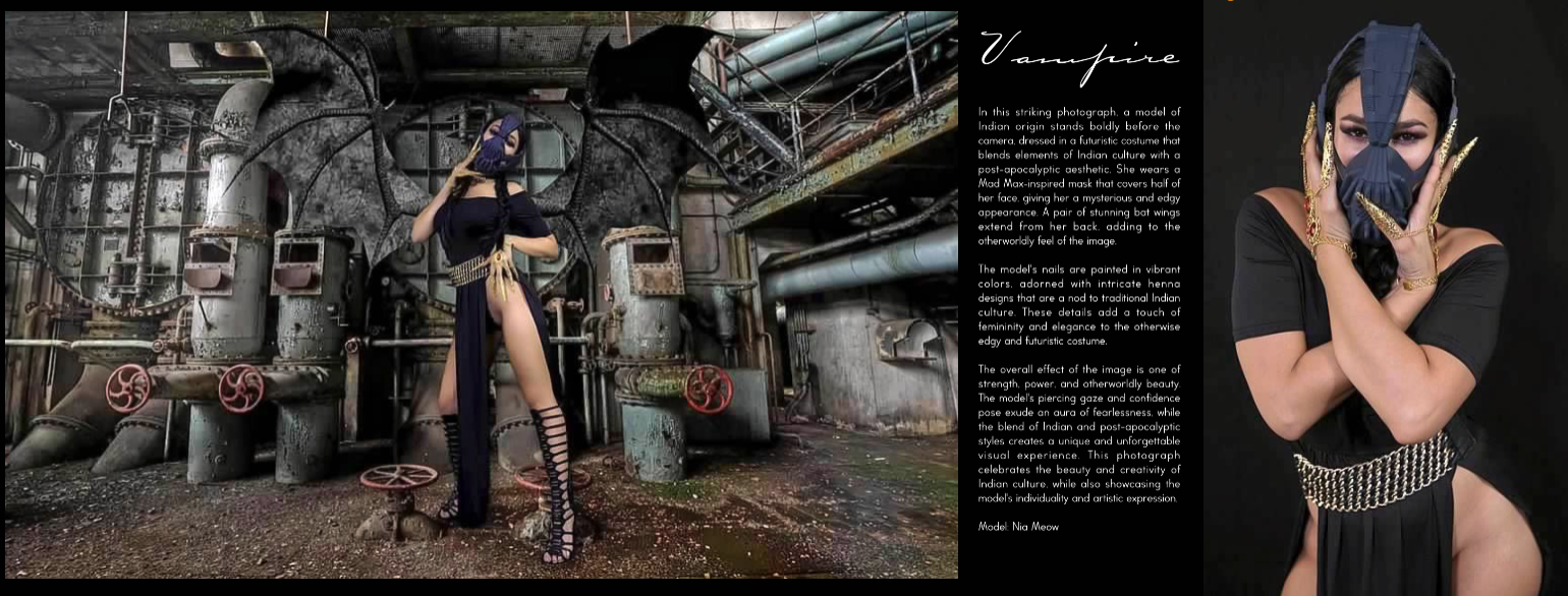 In this striking photograph, a model of Indian origin stands boldly before the camera, dressed in a futuristic costume that blends elements of Indian culture with a post-apocalyptic aesthetic. She wears a Mad Max-inspired mask that covers half of her face, giving her a mysterious and edgy appearance. A pair of stunning bat wings extend from her back, adding to the otherworldly feel of the image.