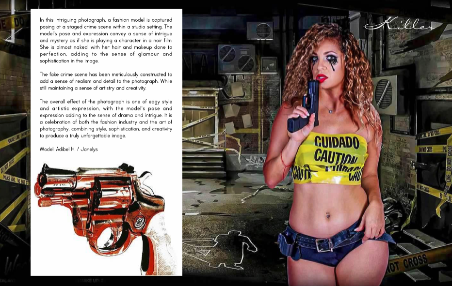 In this intriguing photograph, a fashion model is captured posing at a staged crime scene within a studio setting. The model’s pose and expression convey a sense of intrigue and mystery as if she is playing a character in a noir film. She is almost naked, with her hair and makeup done to perfection, adding to the sense of glamour and sophistication in the image.