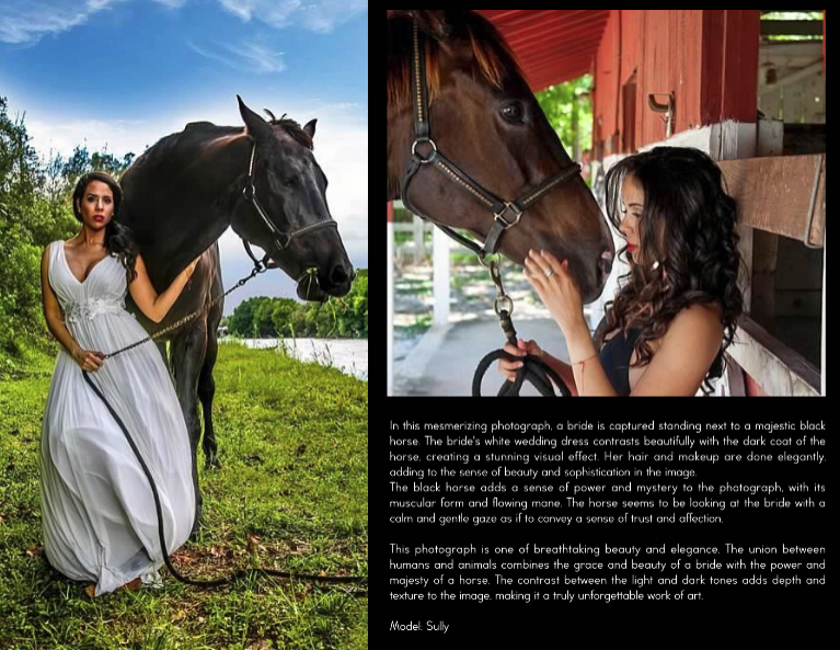 This photograph is one of breathtaking beauty and elegance. The union between humans and animals combines the grace and beauty of a bride with the power and majesty of a horse. The contrast between the light and dark tones adds depth and texture to the image, making it a truly unforgettable work of art.