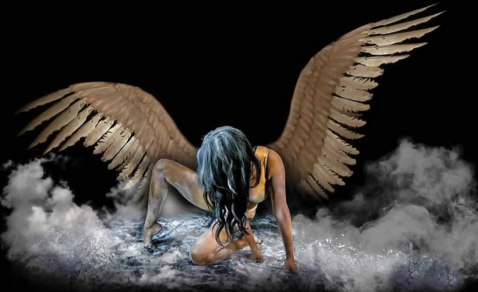 The model’s wings are open and appear to be falling, creating a sense of movement and motion in the image. The model’s face is down the hair is covered in dust, adding to the sense of drama and emotion in the photograph.