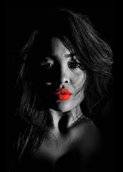 The use of black and white creates a sense of drama and contrast in the image, emphasizing the striking beauty of the models and their poses. The vibrant red of the female model’s dress adds a sense of sensuality and passion to the image.