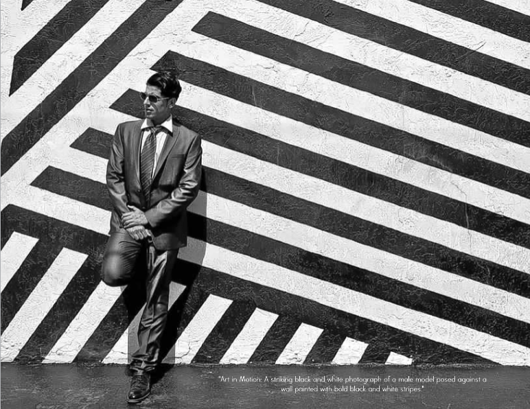“Art in Motion: A striking black and white photograph of a male model posed against a wall painted with bold black and white stripes.”