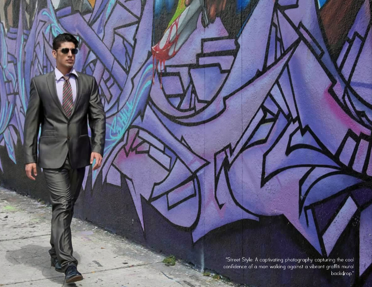“Street Style: A captivating photography capturing the cool confidence of a man walking against a vibrant graffiti mural backdrop.”