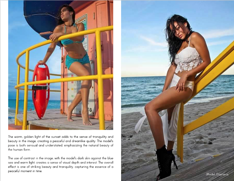 The warm, golden light of the sunset bathes the image in a beautiful glow, creating a sense of intimacy and romance. The natural beauty of the beach and the model’s surroundings add to the sense of tranquility and peacefulness in the image.