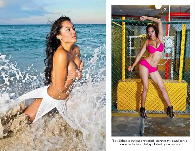 “Sexy Splash: A stunning photograph capturing the playful spirit of a model on the beach, being splashed by the sea foam.”