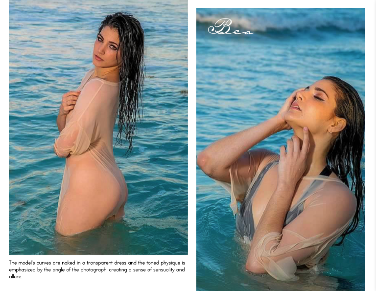 The model’s curves are naked in a transparent dress and the toned physique is emphasized by the angle of the photograph, creating a sense of sensuality and allure.